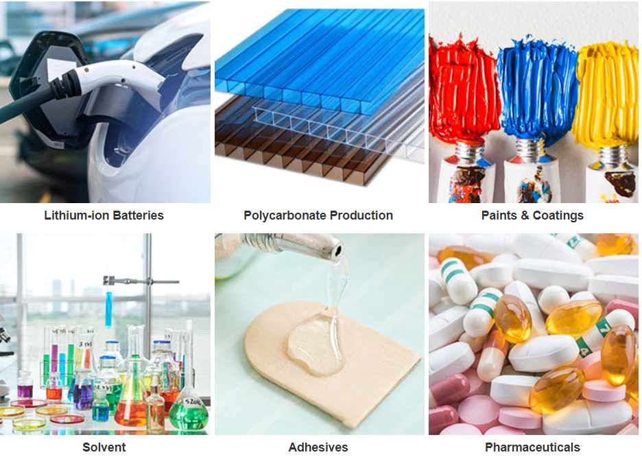 Dimethyl carbonate can replace the traditional toxic raw materials such as phosgene, dimethyl sulfate and methyl chloride. It can be used to synthesize polycarbonate, diphenyl carbonate, isocyanate and allyl diglycol carbonate by non-phosgene method, and can be used to synthesize various carbamate pesticides, such as carbaryl, etc.Organic synthesis intermediates, such as anisole, benzene dimethyl ether, alkyl arylamines, symmetric diaminarbazone, hydrazine methyl formate, etc.;In the pharmaceutical industry, it can be used to produce aminoxazolidinone, ciprofloxacin, β-keto carboxylic acid esters and other pharmaceutical intermediates. In addition, it can also be used as an additive to gasoline and diesel, refrigerator oil and solvent.