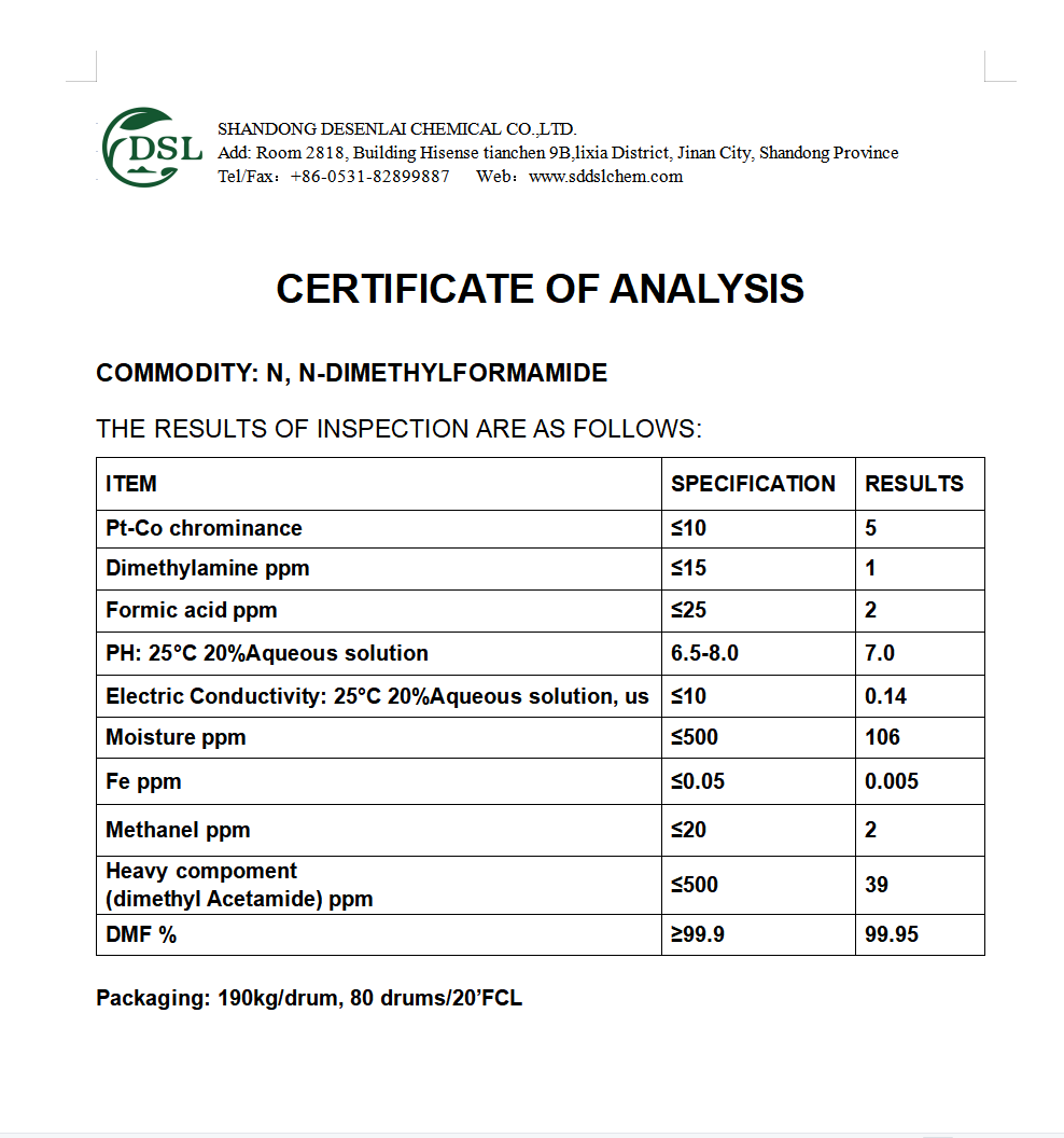 3、Dimethylformamide is not only an extremely versatile chemical raw material, but also an excellent solvent with a wide range of uses. It can be used for wet spinning of polyacrylonitrile fiber and other synthetic fibers, synthesis of polyurethane, plastic film, paint removal agent, and some pigments with low solubility, give the pigment the character of a dye. The Dimethylformamide can be used for aromatics extraction and for the recovery of Butadiene from C _ 4 and C _ 5 fractions, as well as for the recovery of isoprene from paraffin. It has good selectivity for the solubility of isophthalic acid and terephthalic acid: the solubility of isophthalic acid in Dimethylformamide is greater than that of terephthalic acid, solvent extraction in Dimethylformamide or partial crystallization, the two can be separated. In petrochemistry, Dimethylformamide is used as a gas absorbent to separate and refine gases. In organic reactions, Dimethylformamide are widely used not only as solvents but also as important intermediates in organic synthesis. The pesticide industry can be used to produce chlordimeform; In the pharmaceutical industry, it can be used to synthesize sulfadiazine, Doxycycline, cortisone, vitamin B6, iodic glycoside, vermicullin, thiopyrimidine, n-formylsarcomycin, antineoplastic acid, methoxyaromatic mustard, biannitrogen mustard, cyclohexanitrosourea, furosemide, tranexamic acid, pemetasone, medroxyprogesterone, Doxycycline, chlorpheniramine, etc. . The Dimethylformamide is used as a catalyst in hydrogenation, dehydrogenation, dehydration and dehalogenation reactions, resulting in lower reaction temperature and higher purity of the product.