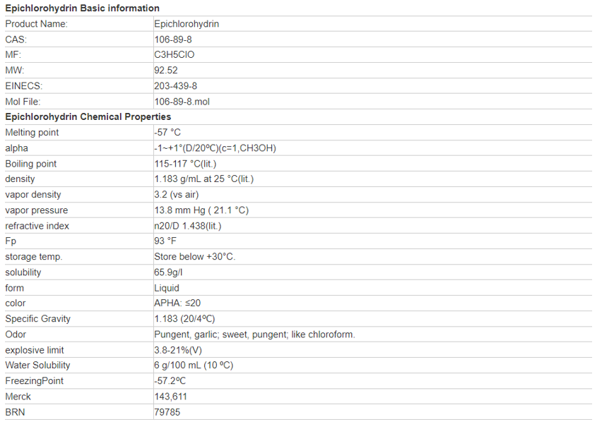 Epichlorohydrin is a synthetic glycerin intermediate, and is also the main raw material of epoxy resin, nitroglycerin explosive, glass fiber reinforced plastic and electrical insulation products. It is also used as a mixture of cellulose ester, resin and cellulose ether. It is also a raw material for the production of surfactants, pharmaceuticals, pesticides, coatings, adhesives, ion exchange resins, plasticizers, glycerol derivatives, glycidyl derivatives and chlorol rubber. All kinds of epoxy resins made from epichlorohydrin and bisphenol A have the characteristics of high adhesion, little shrinkage, chemical corrosion resistance and good stability, and are widely used as coatings, adhesives, reinforcing materials and casting materials. The chlorohydrin rubber produced from epichlorohydrin is a new variety of rubber, which is not easy to expand in general oil and common solvent, has greater flexibility in the presence of plasticizer at low temperature, and has some unique functions better than nitrile, chloroprene and butyl rubber.
