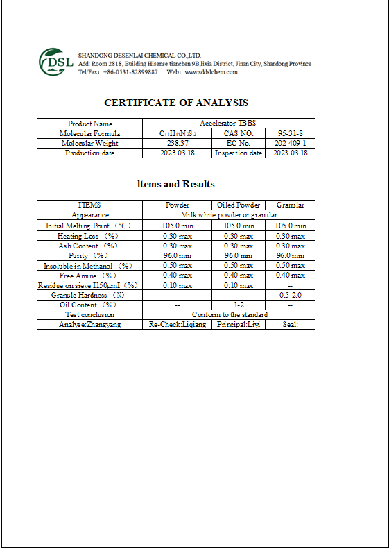 TBBS is a slow-release accelerator for natural rubber and synthetic diene synthetic rubber, is named “Standard Accelerator” because of its good performances. Also it doesn’t produce the carcinogenic nitrosamine during the rubber vulcanization, and therefore it has achieved a wide application in radial tire and green tire industry.